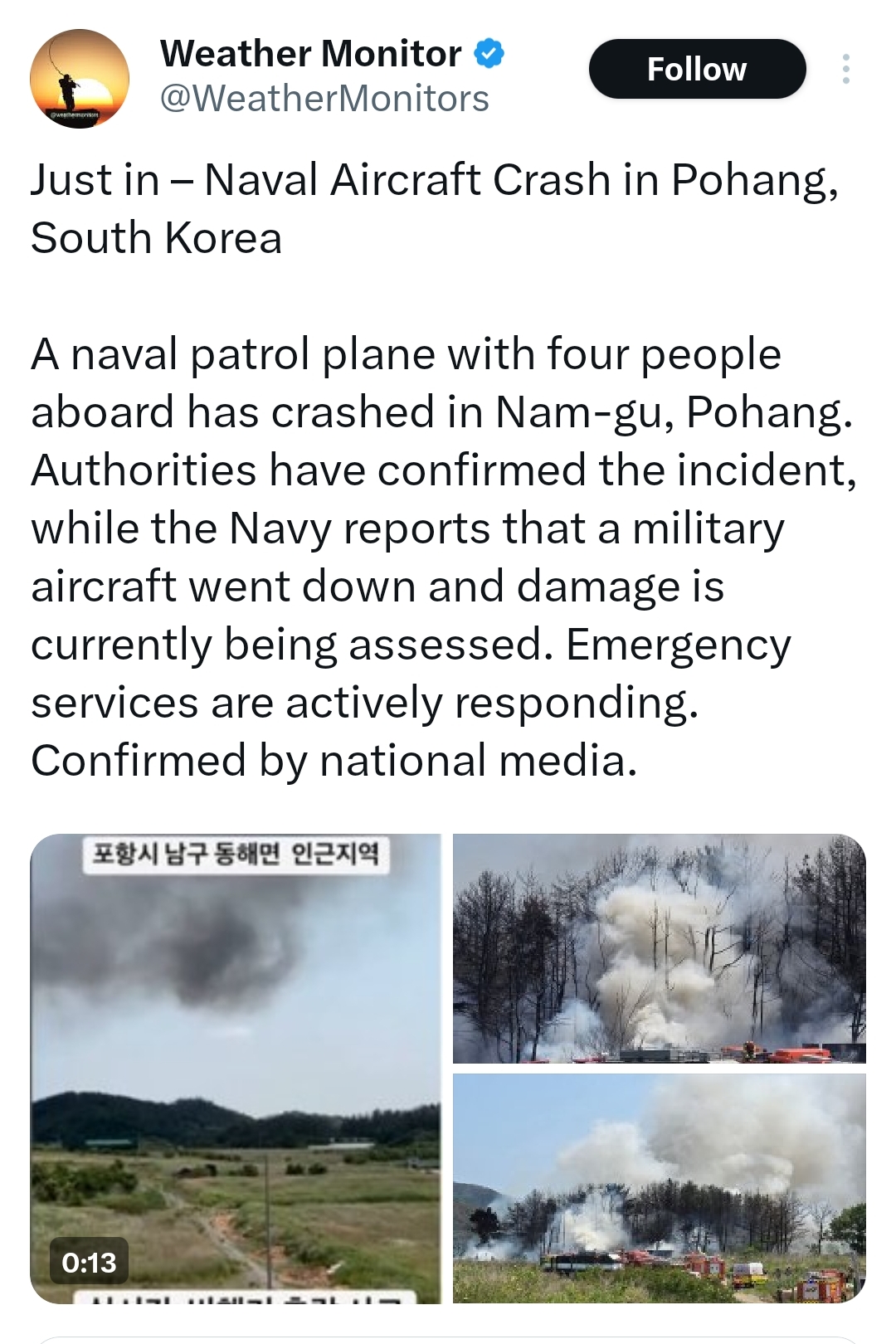 وتداول رواد مواقع التواصل الاجتماعي، لحظة اصطدام الطائرة بالأرض، والنيران تحيط بموقع الحادث، وكتب أحد المغردين على منصة إكس قائلاً:"تحطم طائرة بحرية في بوهانج، كوريا الجنوبية تحطمت طائرة دورية بحرية على متنها أربعة أشخاص في نام-غو، بوهانج. أكدت السلطات الحادث، بينما أفادت البحرية بسقوط طائرة عسكرية، ويجري حاليًا تقييم الأضرار. وتعمل خدمات الطوارئ على الاستجابة بشكل حثيث. وأكدت وسائل الإعلام الوطنية الحادث".