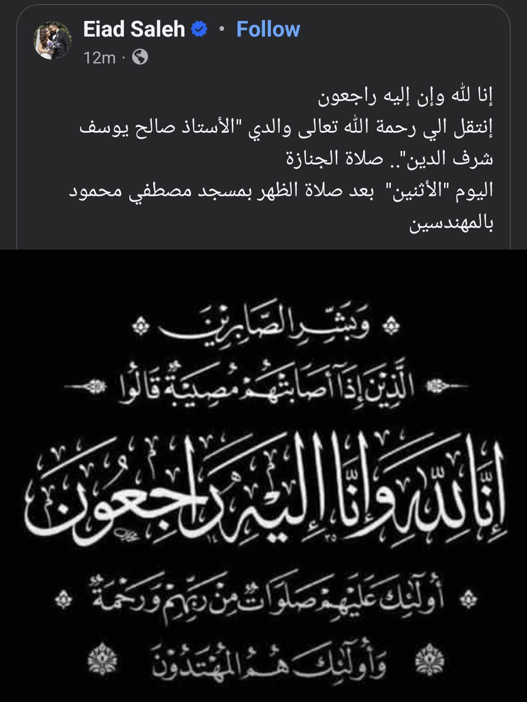 وكان والد السيناريست إياد صالح قد رحل عن عالمنا في الساعات الأولى من صباح يوم الاثنين الماضي، وقد أعلن صالح عن الخبر عبر حسابه الرسمي على موقع التواصل الاجتماعي "فيسبوك"، وشيعت الجنازة بعد صلاة الظهر من مسجد مصطفى محمود بالمهندسين، بحضور عدد من أصدقائه وأفراد أسرته، كما حرص على الحضور الفنانة بسمة داود وزوجها المؤلف هاني سرحان.