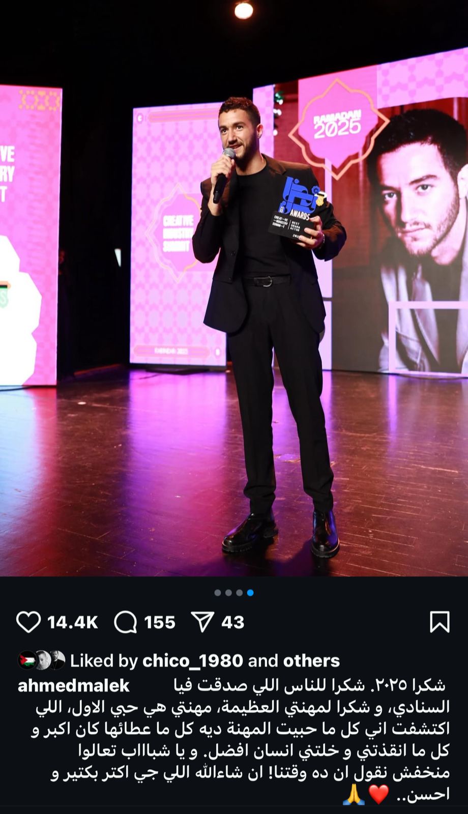 يرصد موقع تحيا مصر، حديث أحمد مالك عن تكريمة وقال:" شكرا ٢٠٢٥. شكرا للناس اللي صدقت فيا السنادي، وشكرا لمهنتي العظيمة، مهنتي هي حبي الأول، اللي اكتشفت إني كل ما حبيت المهنة ديه كل ما عطائها كان أكبر وكل ما أنقذتني وخلّتني إنسان أفضل. ويا شباااب تعالوا منخفش نقول إن ده وقتنا، إن شاء الله اللي جاي أكتر بكتير وأحسن".