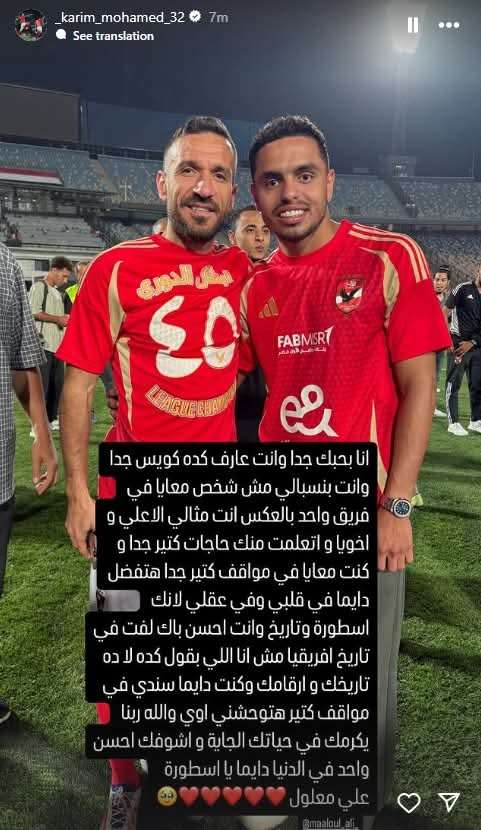 وكتب كريم الدبيس في رسالته عبر ستوري إنستجرام، أنا بحبك جدا وانت عارف كده كويس جدا وانت بنسبالي مش شخص معايا في فريق واحد بالعكس، انت مثالي الأعلى وأخويا واتعلمت منك حاجات كتير جدا.