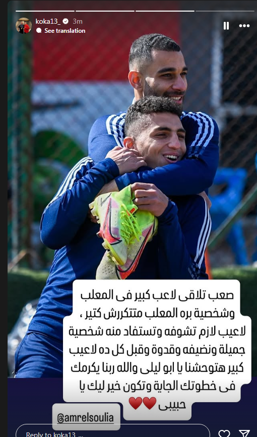 ودع أحمد نبيل"كوكا"، لاعب الفريق الأول لكرة القدم بالنادي الاهلي، زميله في الفريق عمرو السولية، وذلك بعدما أعلن رحيله.