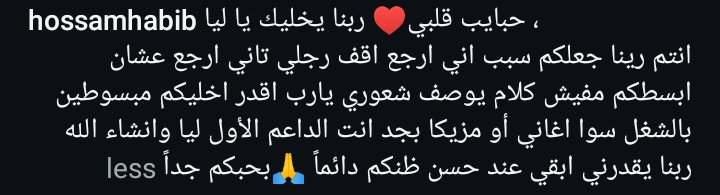 وقال حسام حبيب في منشوره عبر حسابه الرسمي بموقع تبادل الصور والفيديوهات انستجرام والذي رصده موقع تحيا مصر موجها رسالة إلى جمهوره: حبايب قلبي ربنا يخليك يا ليا , انتم رينا جعلكم سبب اني ارجع اقف رجلي تاني ارجع عشان ابسطكم مفيش كلام يوصف شعوري يارب اقدر اخليكم مبسوطين بالشغل سوا اغاني أو مزيكا بجد انت الداعم الأول ليا وانشاء الله ربنا يقدرني ابقي عند حسن ظنكم دائماً.. بحبكم جداً.