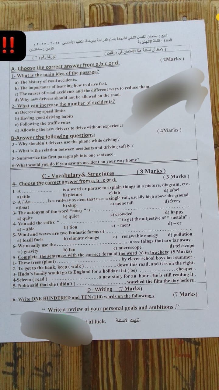 - امتحان اللغة الإنجليزية للصف الثالث الإعدادي