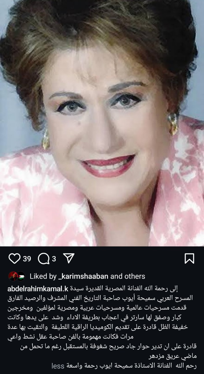 كما حرص الكاتب عبد الرحيم كمال على نعي الراحلة، من خلال منشور عبر حسابه الرسمي على موقع تبادل الصور والفيديوهات انستجرام وكتب عنها عبد الرحيم كمال: “إلى رحمة الله الفنانة المصرية القديرة سيدة المسرح العربي سميحة أيوب صاحبة التاريخ الفني المشرف والرصيد الفارق قدمت مسرحيات عالمية ومسرحيات عربية ومصرية لمؤلفين ومخرجين كبار وصفق لها سارتر في اعجاب بطريفة الاداء وشد على يدها وكانت خفيفة الظل قادرة على تقديم الكوميديا الراقية اللطيفة والتقيت بها عدة مرات فكانت مهمومة بالفن صاحبة عقل نشط واعي، قادرة على أن تدير حوار جاد صريح شغوفة بالمستقبل رغم ما تحمل من ماضي عريق مزدهر، رحم الله الفنانة الأستاذة سميحة أيوب”.