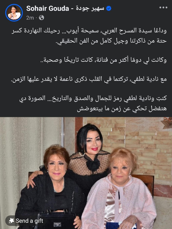 لعل أبرز المشاهير الذين حرصوا على نعي الفنانة الراحلة كانت الإعلامية سهير جودة التي نشرت صورة لهما من الأرشيف تجمعهم بالفنانة الراحلة نادية لطفي، وعلقت عليها بكلمات حزينة تعبر عن شعور الفقد حيث قالت: “وداعًا سيدة المسرح العربي سميحة أيوب رحيلك النهاردة كسر حتة من ذاكرتنا وجيل كامل من الفن الحقيقي، كانت لي دومًا أكثر من فنانة كانت تاريخًا وصحبة مع نادية لطفي تركتما في القلب ذكرى ناعمة لا يقدر عليها الزمن، كنتِ ونادية لطفي رمز للجمال والصدق والتاريخ الصورة دي هتفضل تحكي عن زمن ما بيتعوضش”.