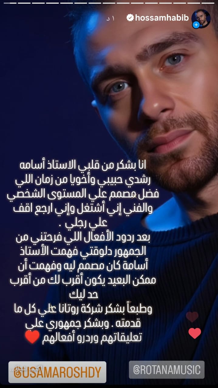 وقال حسام في منشوره: "أنا بشكر من قلبي الأستاذ أسامة رشدي حبيبي وأخويا من زمان اللي فضل مصمم على المستوى الشخصي والفني إني أشتغل وإني أرجع أقف على رجلي. بعد ردود الأفعال اللي فرحتني من الجمهور دلوقتي فهمت الأستاذ أسامة كان مصمم ليه وفهمت أن ممكن البعيد يكون أقرب لك من أقرب حد ليك"، كما شكر حسام شركة روتانا وجمهوره على دعمهم وتشجيعهم المستمر.