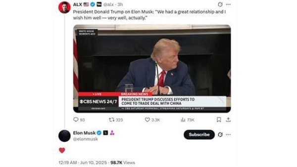في لفتة مقتضبة لكنها ذات دلالة، علّق الملياردير إيلون ماسك بوضع رمز القلب على منشور في منصة "إكس" نقل تصريحات للرئيس الأميركي دونالد ترامب تمنى فيها كل الخير للرئيس التنفيذي لشركتي تسلا وسبيس إكس.