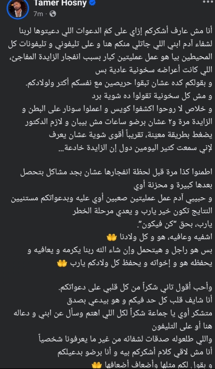وتابع: "اطمنوا كذا مرة قبل لحظة انفجارها عشان بجد مشاكل بتحصل بعدها كبيرة و محزنة أوي وحبيبي آدم عمل عمليتين صعبين أوي عليه وبدعواتكم مستنيين النتايج تكون خير يارب و يعدي مرحلة الخطر بس هو راجل و هيتحمل وإن شاء الله".