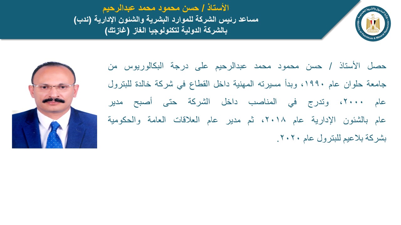 حسن محمود محمد عبد الرحيم، مساعد رئيس الشركة للموارد البشرية والشئون الإدارية بالشركة الدولية لتكنولوجيا الغاز (غازتك)، حيث حصل على درجة البكالوريوس من جامعة حلوان عام 1990، وبدأ مسيرته المهنية داخل القطاع في شركة خالدة للبترول عام 2000، وتدرج في المناصب داخل الشركة حتى أصبح مدير عام الشئون الإدارية عام 2018، ثم مدير عام العلاقات العامة والحكومية بشركة بلاعيم للبترول عام 2020.