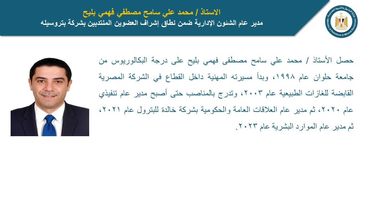 محمد علي سامح مصطفى فهمي بليح، مدير عام الشئون الإدارية ضمن نطاق إشراف العضوين المنتدبين بشركة بتروسيله، حيث حصل على درجة البكالوريوس من جامعة حلوان عام 1998، وبدأ مسيرته المهنية داخل القطاع في الشركة المصرية القابضة للغازات الطبيعية عام 2003، وتدرج في المناصب حتى أصبح مدير عام تنفيذي عام 2020، ثم مدير عام العلاقات العامة والحكومية بشركة خالدة للبترول عام 2021، ثم مدير عام الموارد البشرية عام 2023.