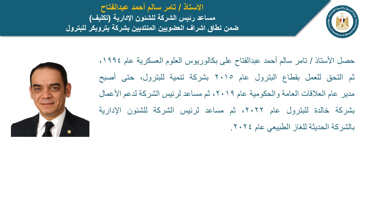 تامر سالم أحمد عبد الفتاح، مساعد رئيس الشركة للشئون الإدارية، وذلك ضمن نطاق إشراف العضوين المنتدبين بشركة بتروبكر للبترول، حيث حصل على بكالوريوس العلوم العسكرية عام 1994، ثم التحق للعمل بقطاع البترول عام 2015 بشركة تنمية للبترول، حتى أصبح مدير عام العلاقات العامة والحكومية عام 2019، ثم مساعد رئيس الشركة لدعم الأعمال بشركة خالدة للبترول عام 2022، ثم مساعد رئيس الشركة للشئون الإدارية بالشركة الحديثة للغاز الطبيعي عام 2024.