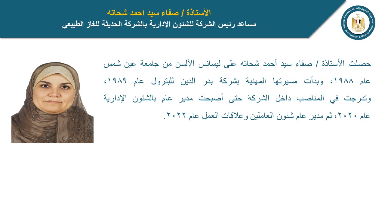 صفاء سيد أحمد شحاتة، مساعد رئيس الشركة للشئون الإدارية بالشركة الحديثة للغاز الطبيعي، حيث حصلت على ليسانس الألسن من جامعة عين شمس عام 1988، وبدأت مسيرتها المهنية بشركة بدر الدين للبترول عام 1989 وتدرجت في المناصب داخل الشركة حتى أصبحت مدير عام الشئون الإدارية عام 2020، ثم مدير عام شئون العاملين وعلاقات العمل عام 2022.