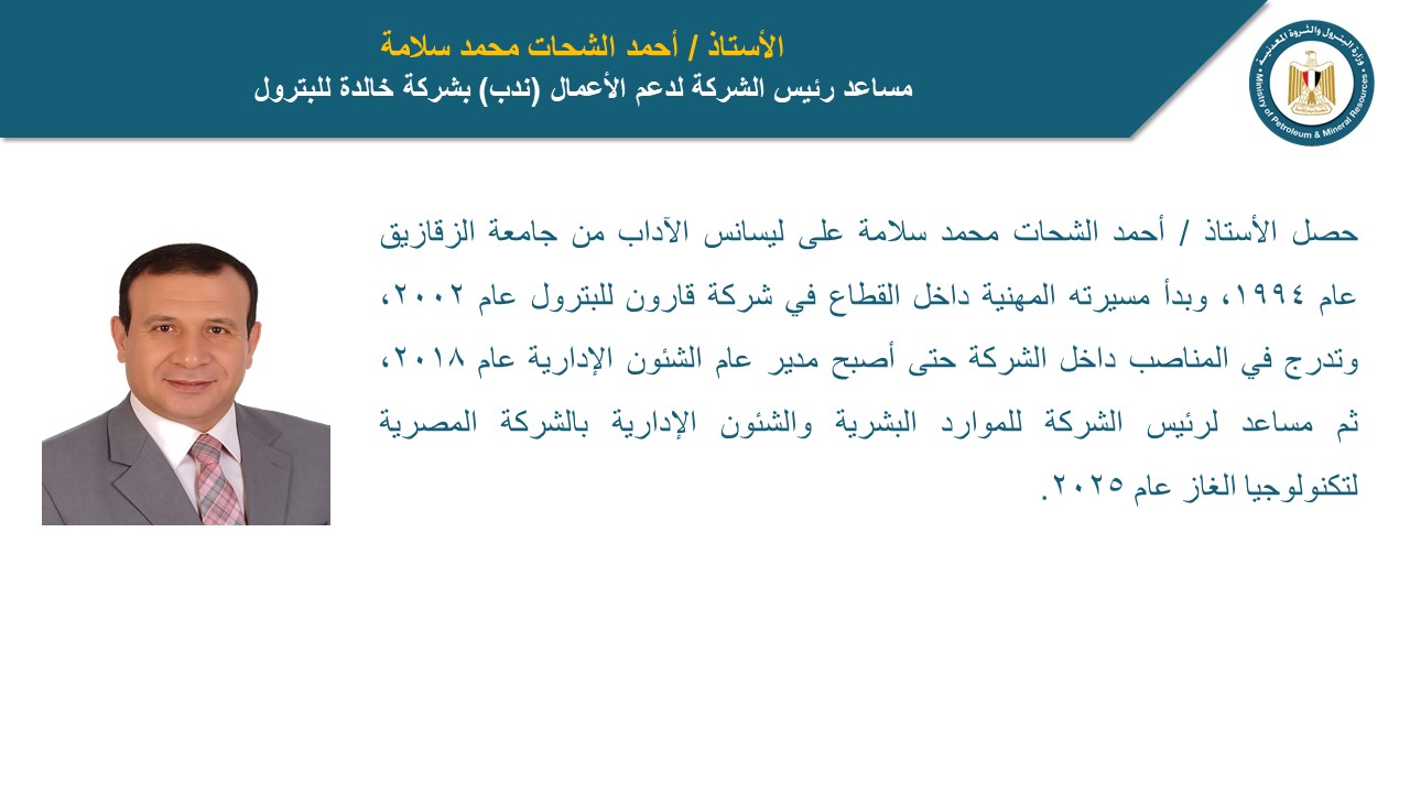 أحمد الشحات محمد سلامة، مساعد رئيس الشركة لدعم الأعمال بشركة خالدة للبترول، حيث حصل على ليسانس الآداب من جامعة الزقازيق عام 1994، وبدأ مسيرته المهنية داخل القطاع في شركة قارون للبترول عام 2002، وتدرج في المناصب داخل الشركة حتى أصبح مدير عام الشئون الإدارية عام 2018، ثم مساعد رئيس الشركة للموارد البشرية والشئون الإدارية بالشركة المصرية لتكنولوجيا الغاز عام 2025.