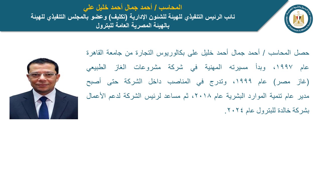 المحاسب أحمد جمال أحمد خليل علي، نائب الرئيس التنفيذي للهيئة للشئون الإدارية، وعضو بالمجلس التنفيذي للهيئة المصرية العامة للبترول، حيث حصل على بكالوريوس التجارة من جامعة القاهرة عام 1997، وبدأ مسيرته المهنية في شركة مشروعات الغاز الطبيعي غاز مصر عام 1999، وتدرج في المناصب داخل الشركة حتى أصبح مدير عام تنمية الموارد البشرية عام 2018، ثم مساعد رئيس الشركة لدعم الأعمال بشركة خالدة للبترول عام 2024.