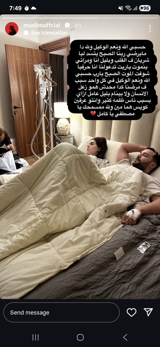 وقال مسلم في منشور رصده موقع تحيا مصر على حسابه الرسمي بموقع تبادل الصور والفيديوهات انستجرام من خلال خاصية ستوري: حسبي الله ونعم الوكيل والله ده ما يرضي ربنا.. الصبح يتسد ليا شريان في القلب وبالليل انا ومراتي بنموت ياريت تدعولنا ، انا حرفيا شوفت الموت الصبح.. حسبي الله في كل واحد سبب في مرضنا.. محدش همه زعل الإنسان ولا بينام الليل ازاي بسبب ناس ظلمة وانتو عارفين هما مين.. ومش مسامحك يا مصطفى يا كامل.