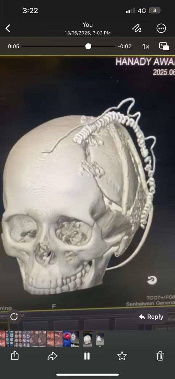 وتمت العملية بنجاح، عبر فتح الجمجمة بطريقة تجميلية تراعي الحفاظ على نمو الشعر، مع تثبيت شبكة التيتانيوم لإعادة الشكل الطبيعي للرأس.