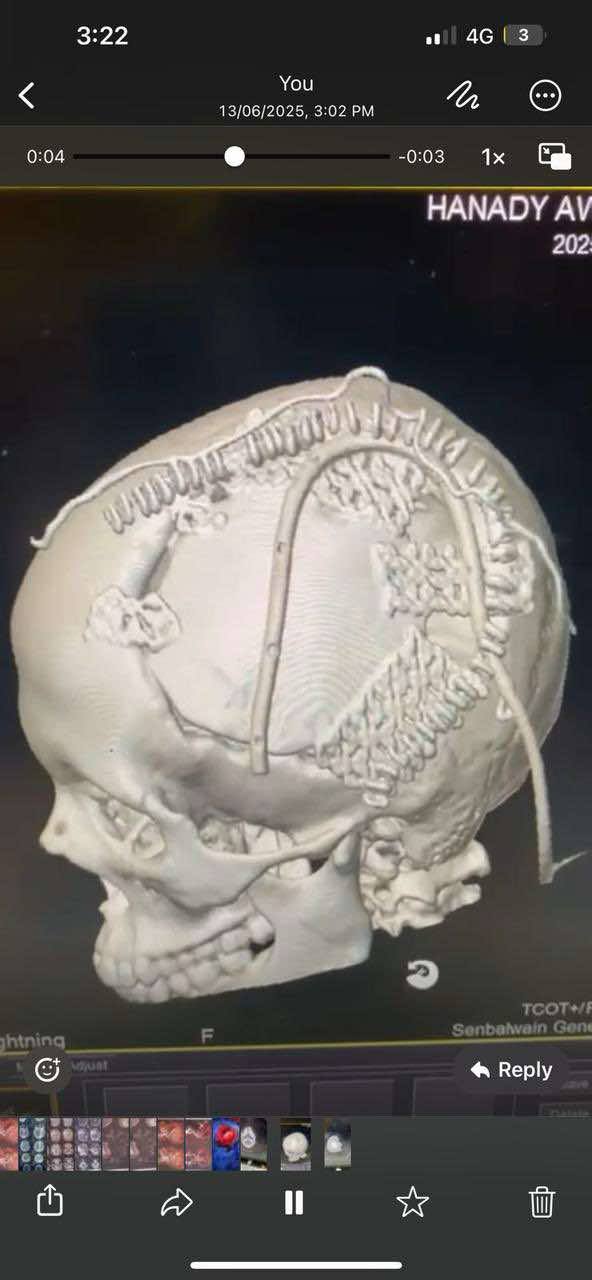 وبعد استقرار الحالة، تقرر إعادة زرع عظام الجمجمة من التجويف البطني إلى موضعها الأصلي، لكن نتيجة لاحتمالية حدوث ضمور بالعظام المزروعة، تم تجهيز شبكة من التيتانيوم ثلاثية الأبعاد لترقيع الجمجمة بالشكل المناسب.