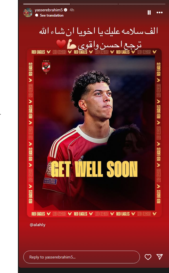 تحيا مصر، وكتب ياسر إبراهيم عبر حسابه الرسمي" إنستجرام": الف سلامة عليك يا اخويا إن شاء الله ترجع أحسن وأقوي من الأول".