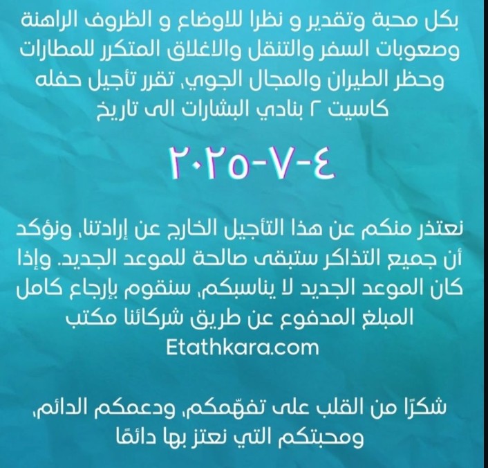 أعلنت الشركة المنظمة عن قرار تأجيل الحفل في بيان رسمي يرصده موقع تحيا مصر نشرته عبر حساباتها على منصات التواصل الاجتماعي، وجاء في البيان: "بكل محبة وتقدير، ونظراً للأوضاع والظروف الراهنة وصعوبات السفر والتنقل والإغلاق المتكرر للمطارات وحظر الطيران والمجال الجوي، تقرر تأجيل حفلة كاسيت ٢ بنادي البشارات". وأضافت الشركة أن القرار تم اتخاذه حفاظاً على سلامة الجميع، مؤكدة أن جميع التذاكر المباعة ستبقى صالحة للموعد الجديد، الذي سيُعلن عنه لاحقًا، كما سيتم إرجاع قيمة التذاكر بالكامل لمن لا يناسبه الموعد الجديد.