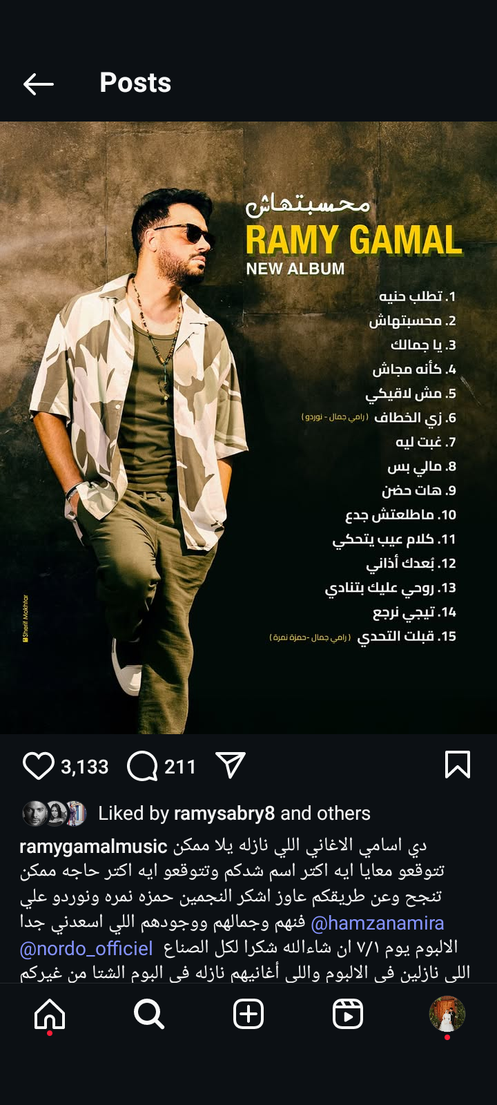 وتابع رامي جمال كاشفا عن موعد طرح ألبوم محسبتهاش، قائلا: الألبوم يوم ٧/١ ان شاءالله شكرا لكل الصناع اللي نازلين في الالبوم واللي أغانيهم نازله في البوم الشتا من غيركم الطريق ما ينفعش.
