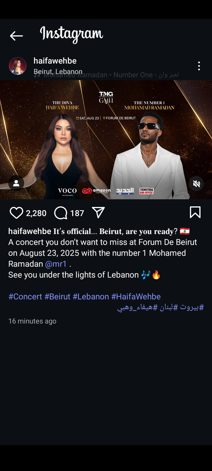 وروجت هيفاء وهبي لـ حفلها الغنائي مع محمد رمضان في لبنان من خلال منشور رصده موقع تحيا مصر عبر حسابه الرسمي بموقع تبادل الصور والفيديوهات انستجرام، فنشرت بوستر الحفل وعلقت عليه، قائلة: حفل لا تريد أن تفوته في Forum De Beirut يوم 23 أغسطس 2025 مع رقم 1 محمد رمضان نراكم تحت أضواء لبنان.