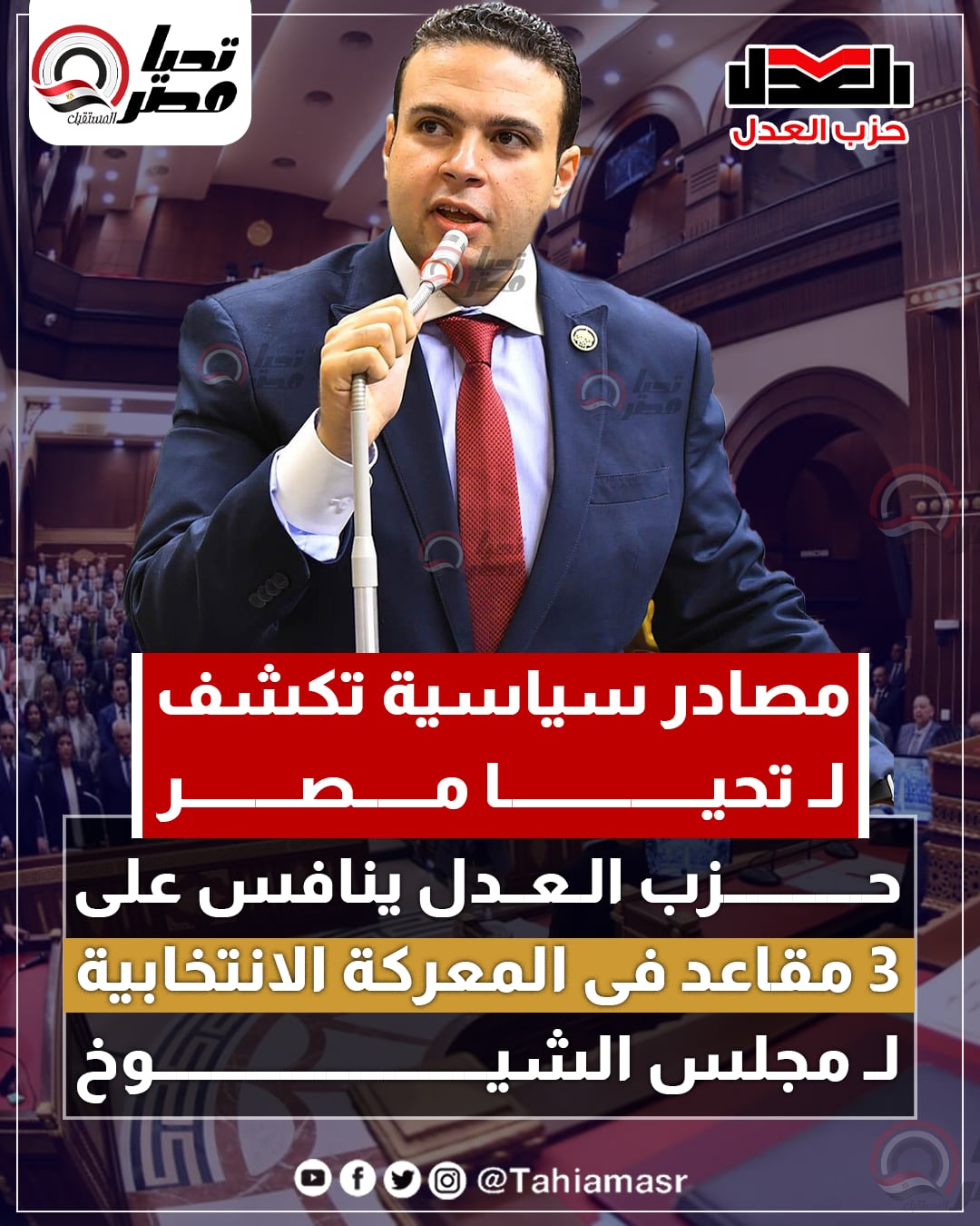 وقال مصدر في تصريح خاص لموقع تحيا مصر ان حزب العدل سيخوض الانتخابات المقبلة لمجلس الشيوخ للحصول على ٣ مقاعد في القائمة والمقاعد الفردي .