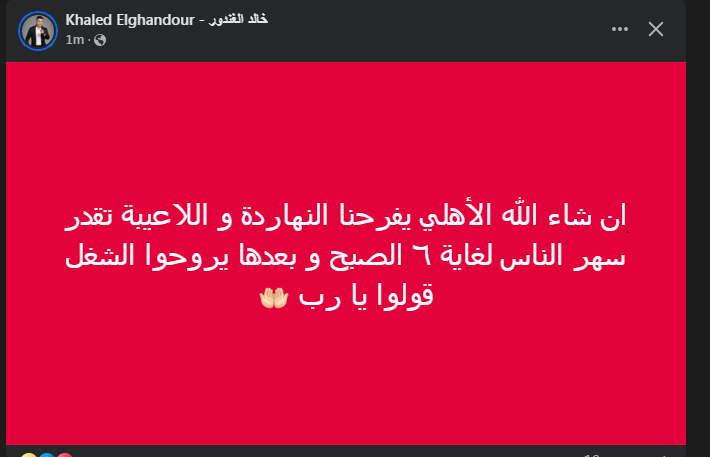 تحيا مصر، وكتب خالد الغندور عبر حسابه الرسمي" فيس بوك":" إن شاء الله الأهلي يفرحنا النهاردة، و اللاعيبة تقدر سهر الناس لغاية ٦ الصبح، و بعدها يروحوا الشغل قولوا يا رب".