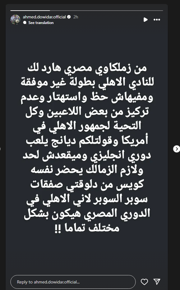 تحيا مصر، وكتب دويدار نجم نادي الزمالك السابق عبر حسابه الرسمي"إنستجرام": من زملكاوي مصري هارد لك للنادي الأهلي، بطولة غير موفقة، ومفيهاش حظ واستهتار وعدم تركيز من بعض اللاعيبن، وكل التحية لجمهور الأهلي فى أمريكا".