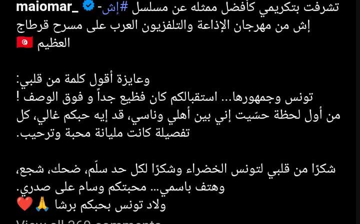 ونشرت مي عمر فيديو لها لحظة تكريمها في مهرجان الإذاعة والتلفزيون بتونس في منشور رصده موقع تحيا مصر وعلقت عليه، قائلة: تشرفت بتكريمي كأفضل ممثله عن مسلسل إش إش من مهرجان الإذاعة والتلفزيون العرب على مسرح قرطاج العظيم.