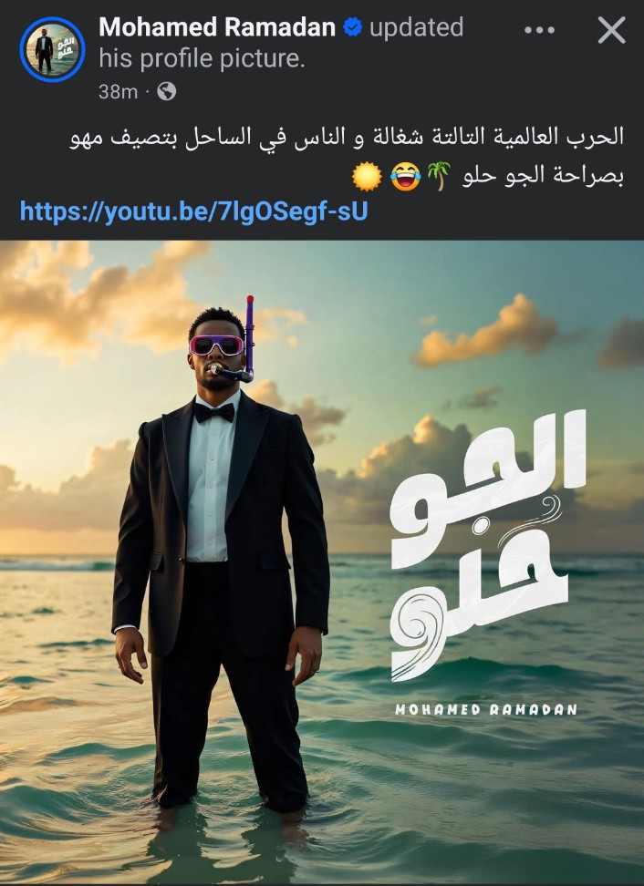كعادته أثار الفنان محمد رمضان حالة من الجدل عبر مواقع التواصل الاجتماعي بعدما طرح أغنيته الجديدة الجو حلو التي ظهر على البوستر الدعائي الخاص بها وهو في البحر مرتديًا بدلة وعلق عليها تعليق مثير للجدل جعله حديث السيوشيال ميديا كما اعتاد منه الجمهور.