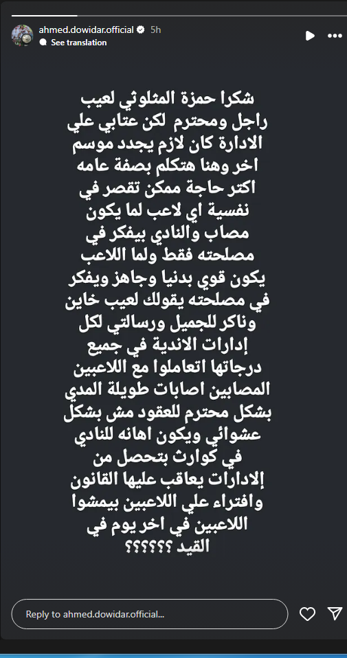 تحيا مصر، وكتب أحمد دويدار عبر حسابه الرسمي" فيس بوك": شكراً حمزة المثلوثي لعيب راجل ومحترم لكن عتابي على الإدارة كان لازم يجدد موسم اخر، وهنا هتكلم بصفة عامة".