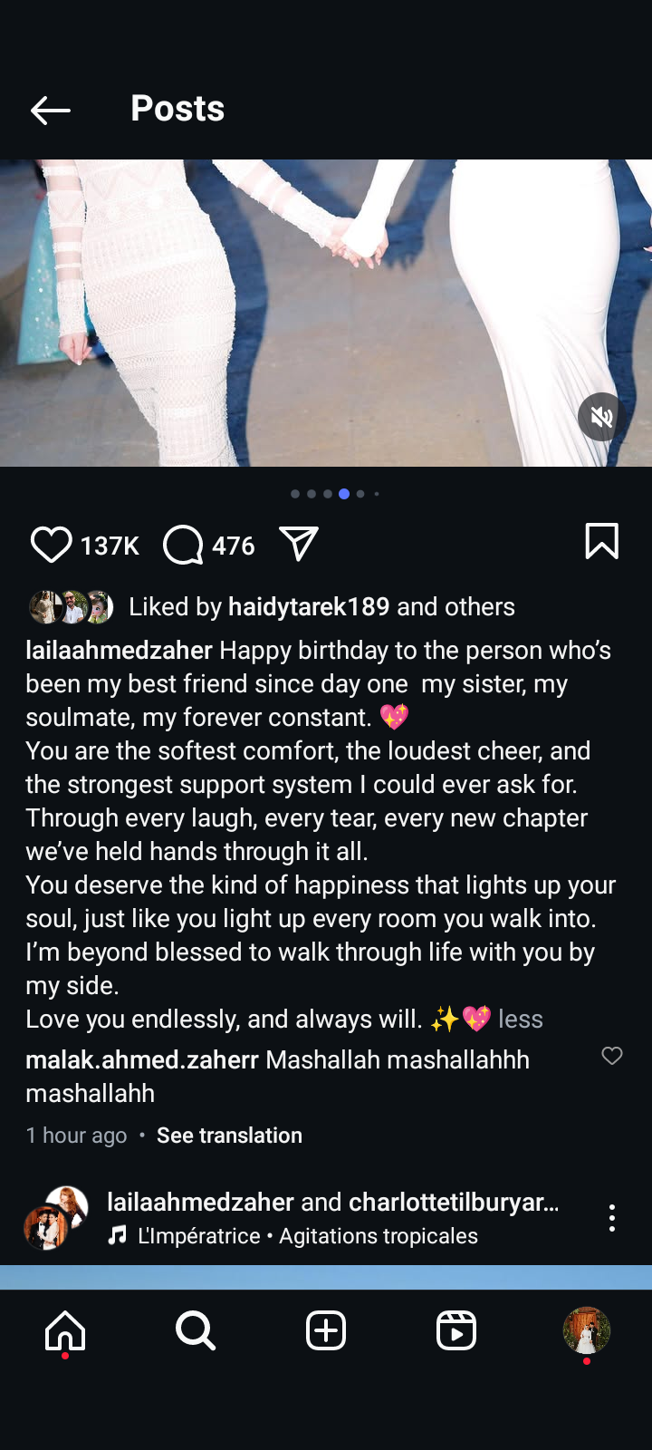 ونشرت ليلى زاهر مجموعة صور لها رفقة شقيقتها ملك على حسابها الرسمي بموقع تبادل الصور والفيديوهات انستجرام في منشور رصده موقع تحيا مصر وعلقت عليه: عيد ميلاد سعيد للشخص الذي كان أفضل صديق لي منذ اليوم الأول أختي، توأم روحي، الثابت إلى الأبد.. أنت أنعم راحة، وأعلى هتاف، وأقوى نظام دعم ممكن أطلبه، من خلال كل ضحكة، كل دمعة، كل فصل جديد تمسكنا بأيدينا خلال كل شيء.