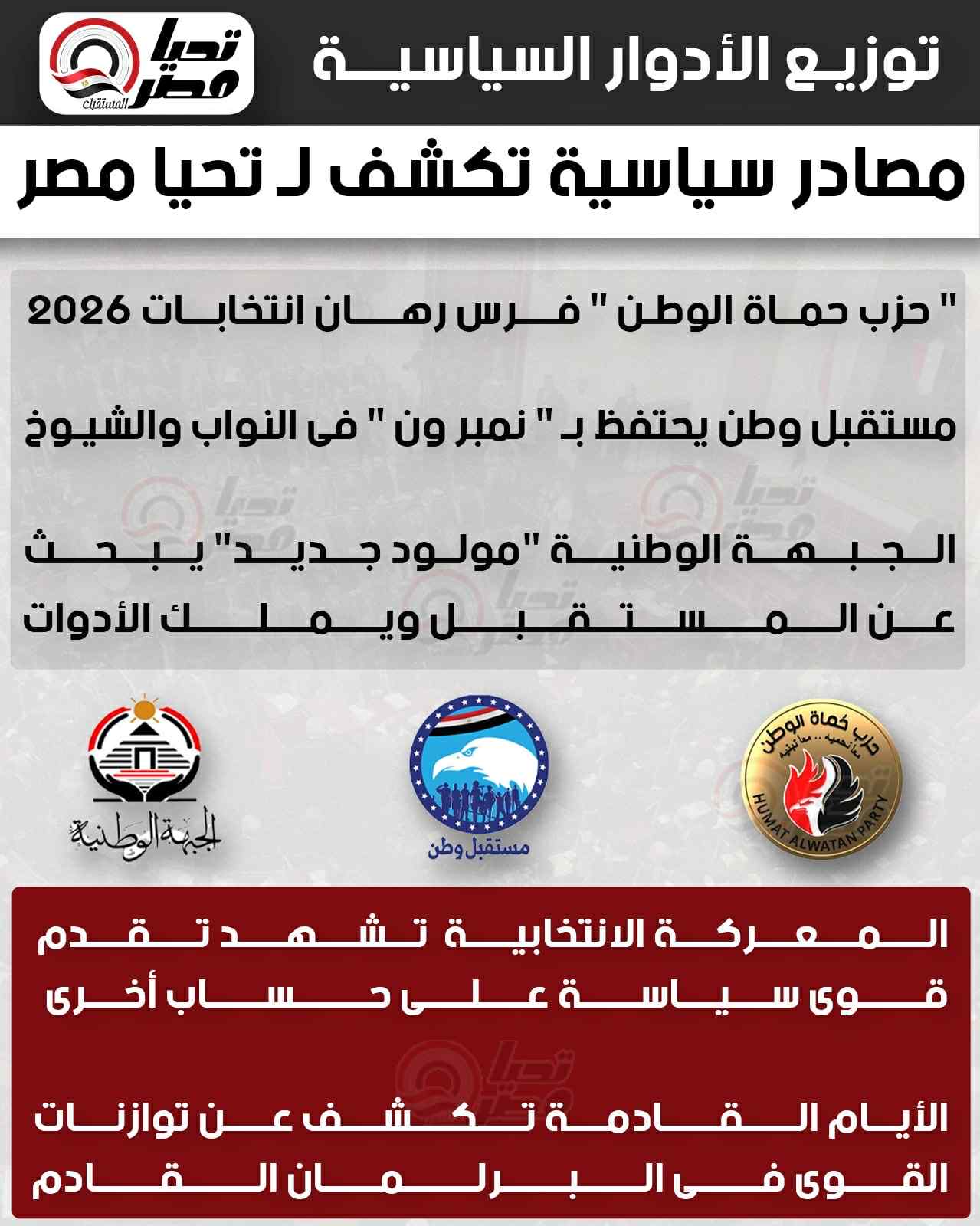 المصادر السياسية، وفي إفادات لاتتوقف، أكدت لموقع "تحيا مصر" أن هناك معلومات جديدة ومستمرة تصل تباعًا حول توزيع الأدوار السياسية وتقدم بعض القوى على حساب أخرى، مما يعيد تشكيل الخريطة البرلمانية المصرية، وأهمها خلال الساعات الماضية، أن اسم حزب "حماة وطن" باعتباره لاعبًا رئيسيًا وصاعدًا بثبات نحو موقع متقدم في ترتيب المقاعد المتوقعة.