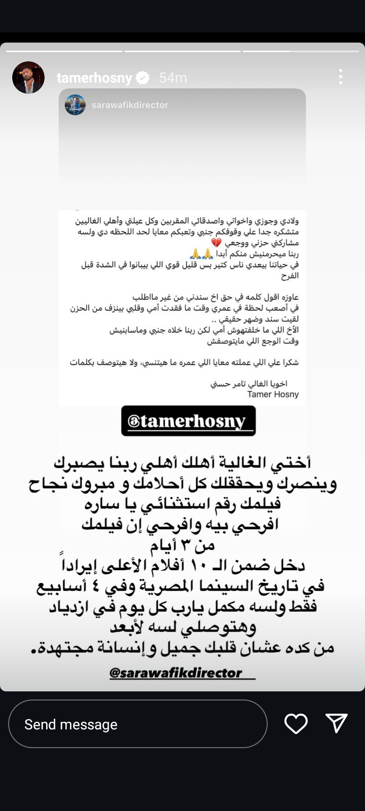 ورد تامر حسني على منشور سارة وفيق من خلال خاصية ستوري عبر موقع تبادل الصور والفيديوهات انستجرام: اختي الغالية اهلك اهلي، ربنا يصبرك وينصرك ويحقق لك كل أحلامك ومبروك نجاح فيلمك رقم اسثنائي يا سارة افرحي بيه وافرحي أن فيلمك من 3 أيام بس دخل ضمن الـ 10 أيام الأعلى إيرادا في تاريخ السينما المصرية وفي 4 أسابيع فقط ولسة مكمل.