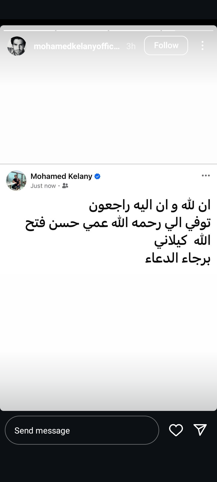 أعلن الفنان محمد كيلاني منذ قليل وفاة عمه وذلك على حسابه الرسمي بموقع التواصل الاجتماعي فيسبوك، دون الكشف عن اي تفاصيل خاصة بالوفاة أو سببها أو موعد ومكان الجنازة والعزاء.