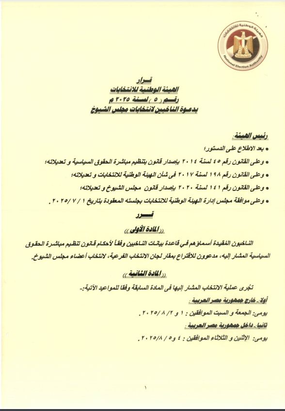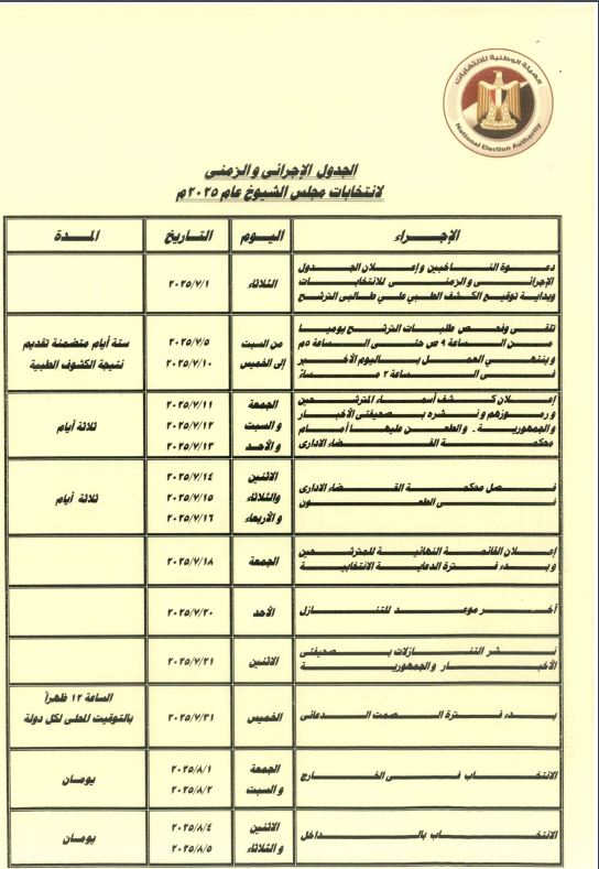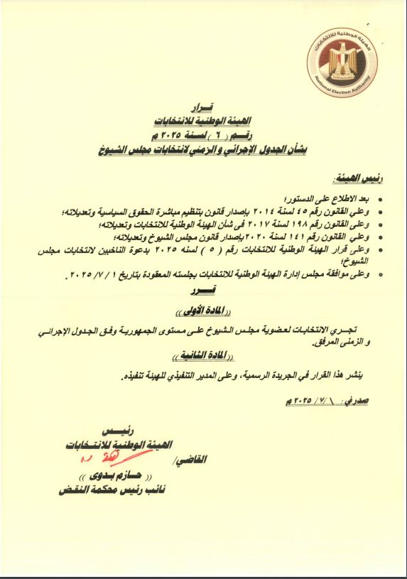وعقب ذلك أعلن رئيس الهيئة الوطنية للانتخابات المستشار حازم بدوؤ دعوة المصريين لانتخابات مجلس الشيوخ 2025 حيث تجرى الانتخابات خارج مصر يومى الجمعة والسبت 1و2 أغسطس 2025 وتجرى الانتخابات داخل مصر يومى الاثنين والثلاثاء 4و5 أغسطس 2025 وتجرى انتخابات الإعادة خارج مصر يومى الاثنين والثلاثاء 25 و26 أغسطس 2025 وتجرى انتخابات الإعادة داخل مصر يومى الأربعاء والخميس 27و28 أغسطس 2025