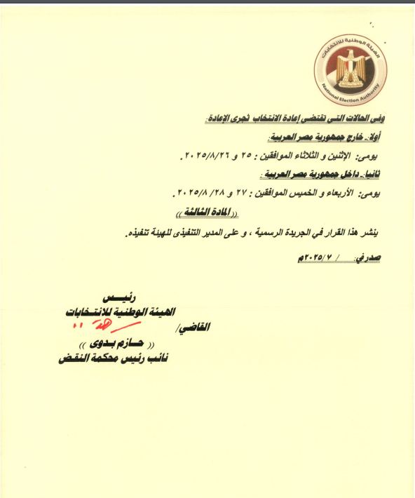 تجرى انتخابات الإعادة داخل مصر يومى الأربعاء والخميس 27و28 أغسطس 2025