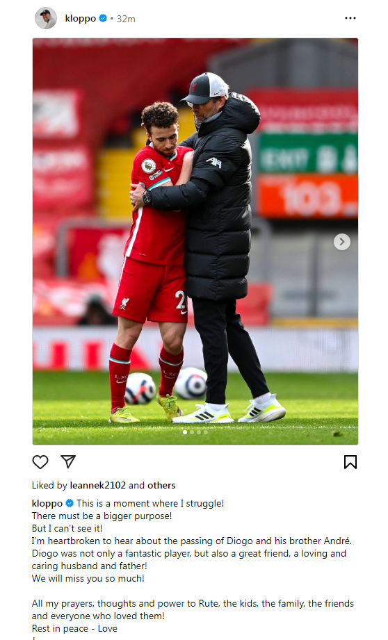 تحيا مصر، وكتب كلوب عبر حسابه الرسمي" إنستجرام":"هذه لحظةٌ أعاني فيها،لا بد أن هناك غايةً أكبر،لكنني لا أستطيع رؤيتها،أُحزنني نبأ وفاة ديوغو وشقيقه أندريه.".