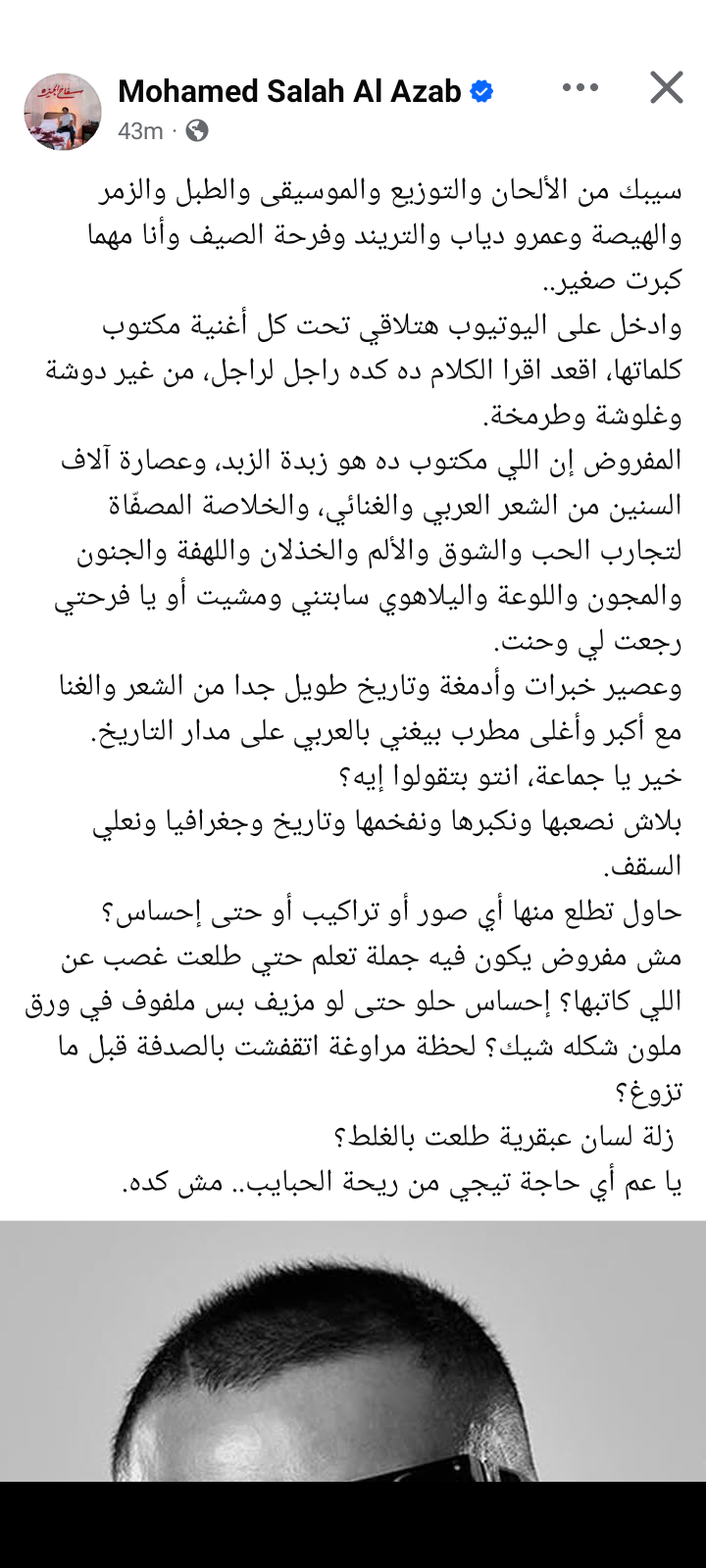 وكتب محمد صلاح العزب في منشور رصده موقع تحيا مصر على حسابه الرسمي بموقع التواصل الاجتماعي فيسبوك: سيبك من الألحان والتوزيع والموسيقى والطبل والزمر والهيصة وعمرو دياب والتريند وفرحة الصيف وأنا مهما كبرت صغير.. وادخل على اليوتيوب هتلاقي تحت كل أغنية مكتوب كلماتها، اقعد اقرا الكلام ده كده راجل لراجل، من غير دوشة وغلوشة وطرمخة.