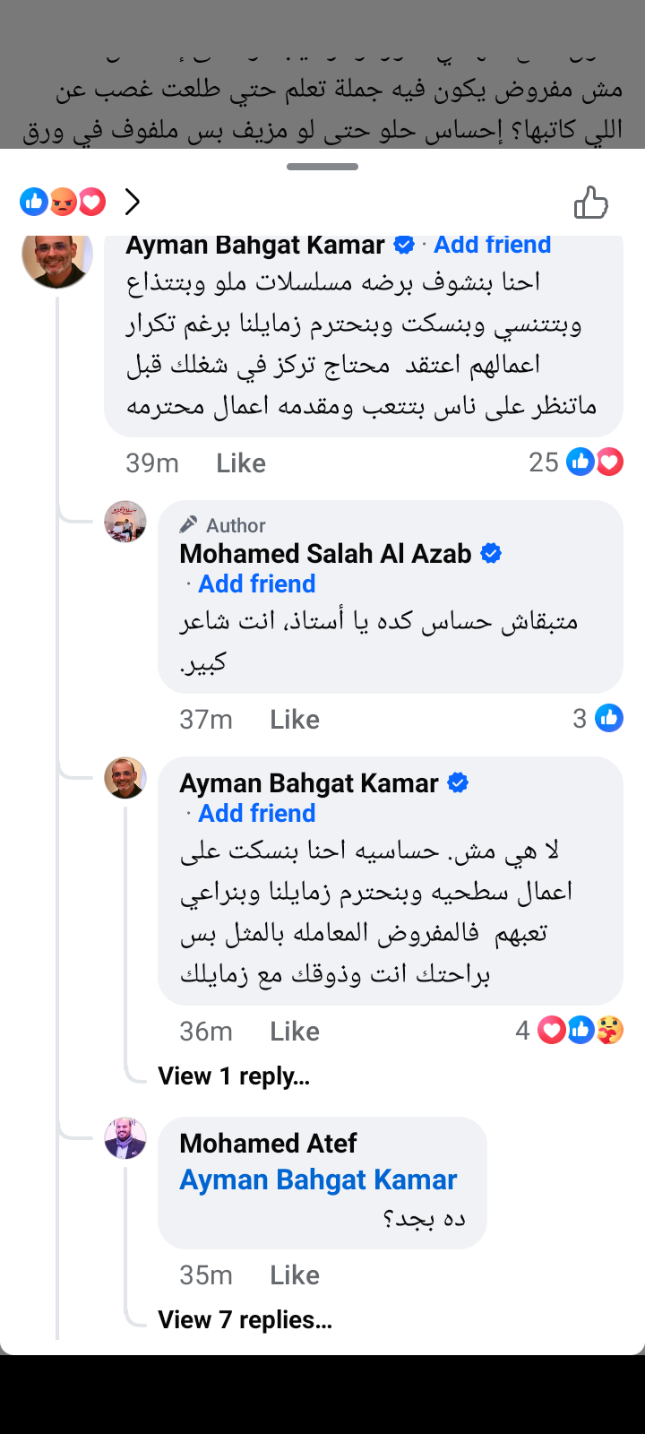ورد الشاعر الغنائي أيمن بهجت على تصريحات محمد صلاح العزب، قائلا: احنا بنشوف برضه مسلسلات ملو وبتتذاع وبتتنسي وبنسكت وبنحترم زمايلنا برغم تكرار اعمالهم اعتقد محتاج تركز في شغلك قبل ماتنظر على ناس بتتعب ومقدمه اعمال محترمه، وبنسكت على اعمال سطحيه وبنحترم زمايلنا وبنراعي تعبهم فالمفروض المعامله بالمثل بس براحتك انت وذوقك مع زمايلك، وبشوف لعذب مسلسلات ساذجه جدا ومكرره وبحترم زمالته وده عهدي بزمايلي بصراحة.