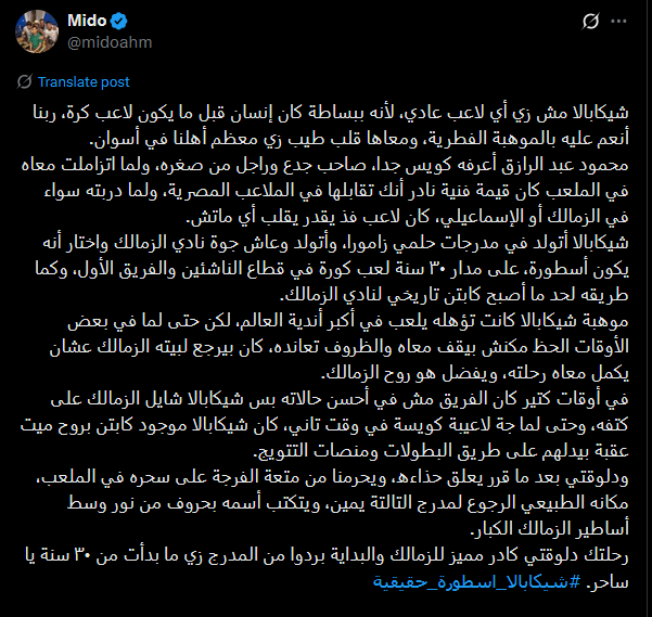 وأضاف أحمد حسام ميدو في تصريحاته عبر إكس، شيكابالا مش زي أي لاعب عادي، لأنه ببساطة كان إنسان قبل ما يكون لاعب كرة، ربنا أنعم عليه بالموهبة الفطرية، ومعاها قلب طيب زي معظم أهلنا في أسوان.