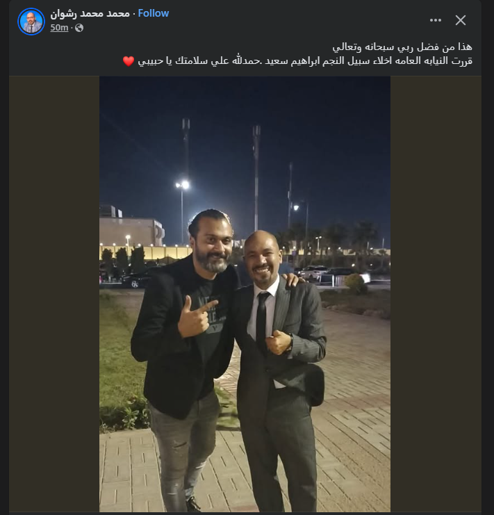 تحيا مصر، وكتب محمد رشوان عبر حسابه الرسمي" إنستجرام":" هذا من فضل ربي سبحانه وتعالي، قررت النيابة العامة إخلاء سبيل إبراهيم سعيد، الحمدلله ، مبروك يانجم".