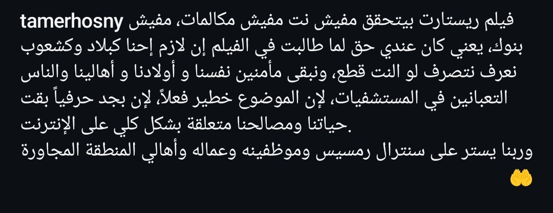 نشر تامر حسني عبر حسابه الرسمي على موقع تبادل الصور والفيديوهات انستجرام مشهد من فيلم ريستارت الذي يُعرض حاليا في السينمات ويسلط الضوء على مشاكل السوشيال ميديا كما شهد أيضًا فصل الانترنت عن العالم في نهاية الفيلم، وربط تامر حسني الفيلم بحريق سنترال رمسيس وأكد أن الفيلم بذلك يكون سلط الضوء على مشاكل حقيقية من أرض الواقع، وقال تامر حسني عبر حسابه على انستجرام الذي يرصده موقع تحيا مصر: "فیلم ریستارت بيتحقق مفيش نت مفيش مكالمات مفيش بنوك، يعني كان عندي حق لما طالبت في الفيلم إن لازم إحنا كبلاد وكشعوب نعرف نتصرف لو النت قطع، ونبقى مأمنين نفسنا وأولادنا و أهالينا والناس التعبانين في المستشفيات، لإن الموضوع خطير فعلاً، لإن بجد حرفياً بقت حياتنا ومصالحنا متعلقة بشكل كلي على الإنترنت وربنا يستر على سنترال رمسيس وموظفينه وعماله وأهالي المنطقة المجاورة".