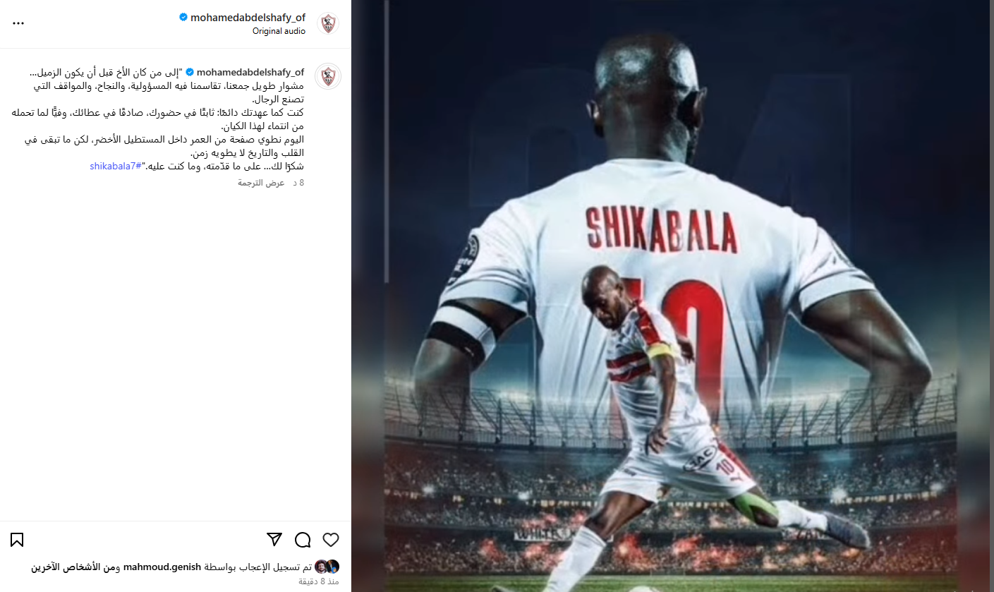 "شكرًا لك على ما قدّمته".. محمد عبد الشافي لاعب الزمالك السابق يوجه رسالة مؤثرة لـ شيكابالا