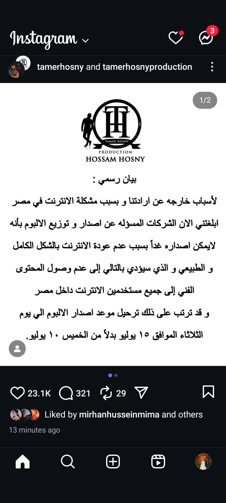 منشور تامر حسني وتابع تامر حسني في بيانه: وقد ترتب على ذلك ترحيل موعد إصدار الألبوم إلى يوم الثلاثاء الموافق 15 يوليو بدلا من الخميس 10 يوليو.
