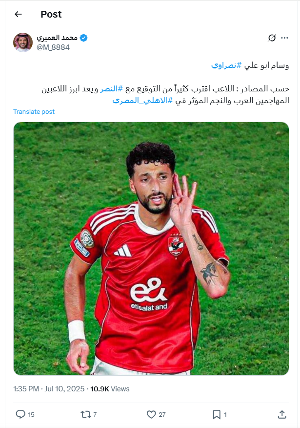 دخل نادي النصر السعودي، سباق التعاقد مع المهاجم الفلسطيني وسام أبو علي لاعب الفريق الكروي الأول بالنادي الأهلي، وذلك لتدعيم خط الهجوم خلال فترة الانتقالات الصيفية الجارية، ويستعرض تحيا مصر التفاصيل.