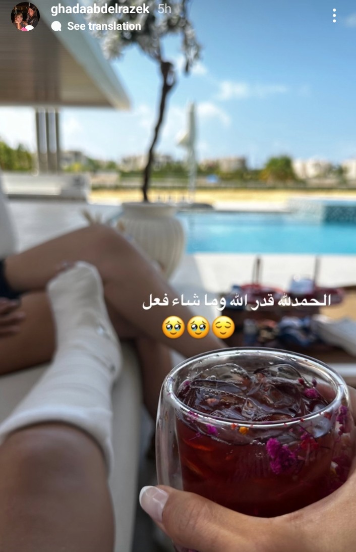 شاركت الفنانة غادة عبد الرازق الجمهور صورة قدمها بالجبس في أحدث ظهور عبر حسابها الرسمي على موقع تبادل الصور والفيديوهات انستجرام مما أثار قلق الجمهور عليها، وعلقت قائلة وفقًا لما رصد موقع تحيا مصر: "قدر الله وماشاء فعل"، دون الكشف عن تفاصيل إصابتها هو ما جعلها حديث السوشيال ميديا وتسائل الكثيرون عن تفاصيل إصابتها.