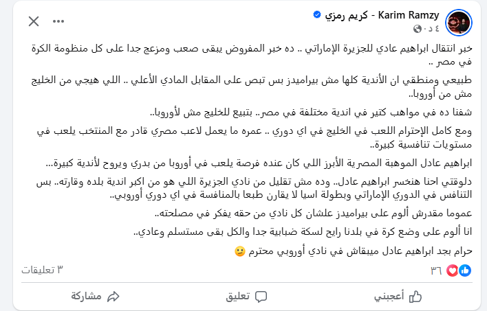 وكتب كريم رمزي على حسابه الشخصي على فيس بوك: "خبر انتقال إبراهيم عادل للجزيرة الإماراتي، ده خبر المفروض يبقى صعب ومزعج جدًا على كل منظومة الكرة في مصر.. طبيعي ومنطقي إن الأندية كلها، مش بيراميدز بس، تبص على المقابل المادي الأعلى، واللي هيجي من الخليج مش من أوروبا".