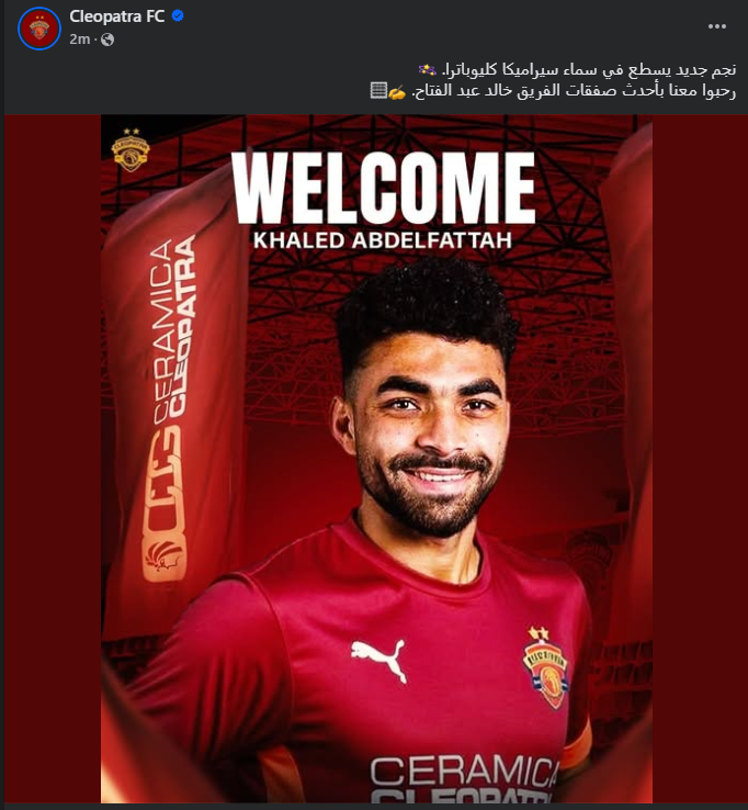 تحيا مصر، ونشرت الصفحة الرسمية لنادي سيراميكا عبر فيس بوك": نجم جديد يسطع في سماء سيراميكا كليوباترا، رحبوا معنا بأحدث صفقات الفريق خالد عبد الفتاح".
