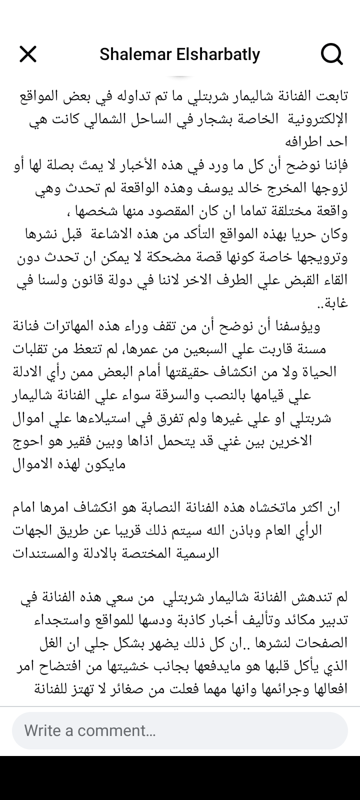 وقالت شالميار الشربتلي في بيان رصده موقع تحيا مصر على حسابها الرسمي بموقع التواصل الاجتماعي فيسبوك: تابعت الفنانة شاليمار شربتلي ما تم تداوله في بعض المواقع الإلكترونية الخاصة بشجار في الساحل الشمالي كانت هي احد اطرافه فإننا نوضح أن كل ما ورد في هذه الأخبار لا يمتّ بصلة لها أو لزوجها المخرج خالد يوسف وهذه الواقعة لم تحدث وهي واقعة مختلقة تماما ان كان المقصود منها شخصها ،وكان حريا بهذه المواقع التأكد من هذه الاشاعة قبل نشرها وترويجها خاصة كونها قصة مضحكة لا يمكن ان تحدث دون القاء القبض علي الطرف الاخر لاننا في دولة قانون ولسنا في غابة.